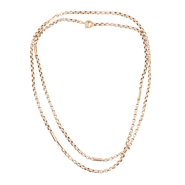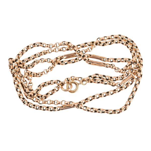With belcher and trombone links, with a bolt ring clasp, in 9ct gold, measuring 87.5cm in length, gross weight 14.7 grams