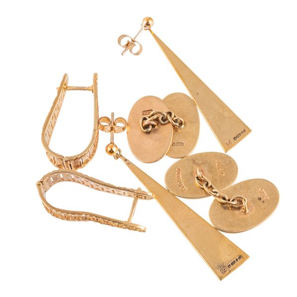 One pair of earrings triangular drops, the other openwork oval hoop earrings, the cufflinks engraved with HW initials, all in 9ct gold, gross weight 12.9 grams