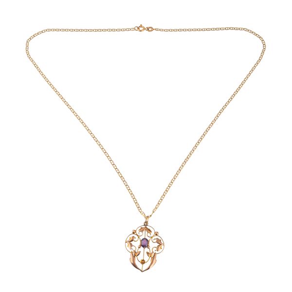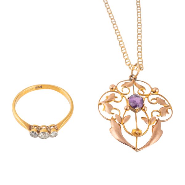 The pendant mounted with a central amethyst, in 9ct gold on a 9ct gold chain, gross weight 4.9 grams, together with a three stone diamond ring, in 18ct gold, size P, gross weight 2 grams, with a box