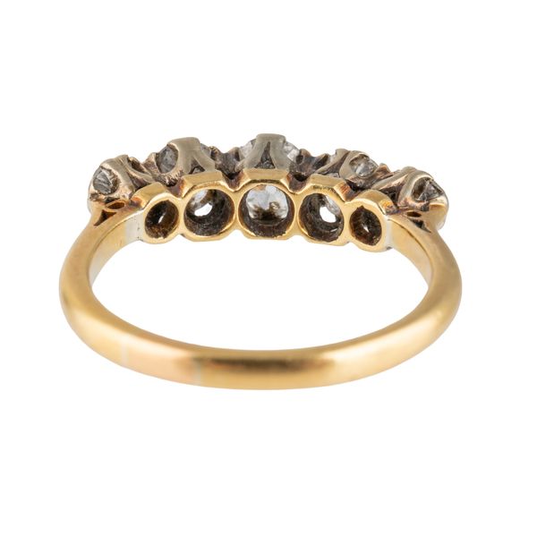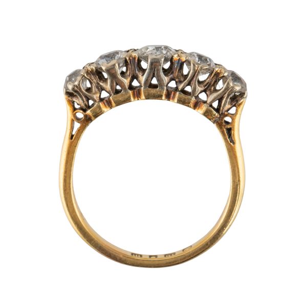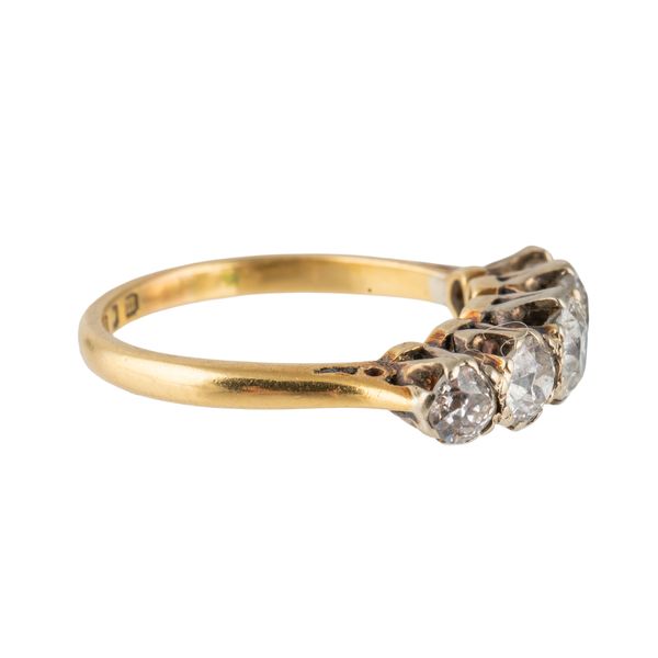 Mounted with five old cut diamonds, the largest weighing an estimated 0.42 carats, all claw set in 18ct gold, London, 1927, size N, gross weight 3.4 grams