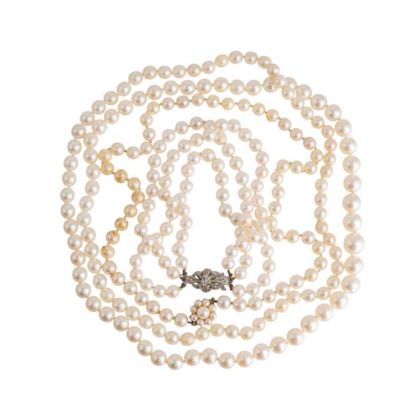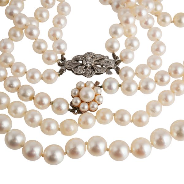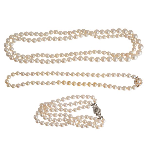 Comprising; a graduated string of pearls with no clasp, a short pearl necklace with a 9ct gold and pearl clasp, measuring 40cm in length and a three string pearl bracelet with a diamond set clasp, measuring 20cm in length