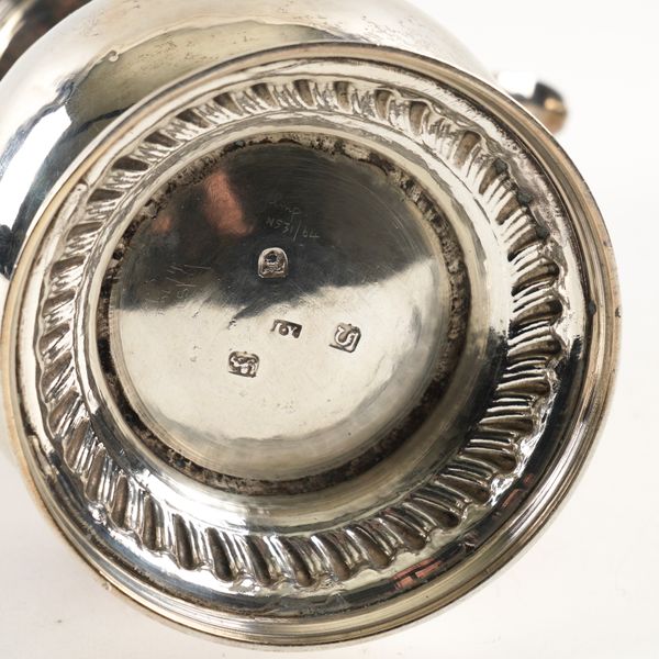 Of baluster form, decorated with a gadrooned rim, with a stylized bud finial to the hinged lid and with a wooden handle, height 27cm, London 1768, maker's mark James Young, gross weight 915 grams