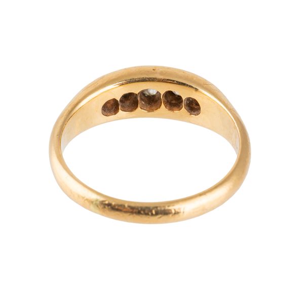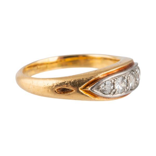 Mounted with a row of graduated old cut diamonds, within a boat shaped setting, indistinct mark, size K½, gross weight 4.4 grams