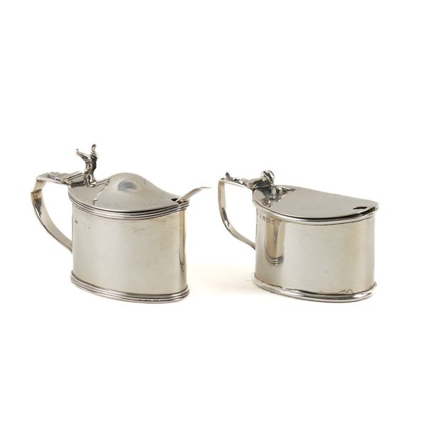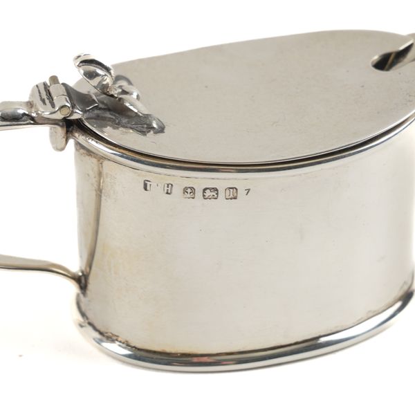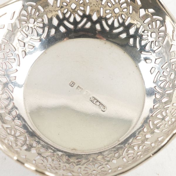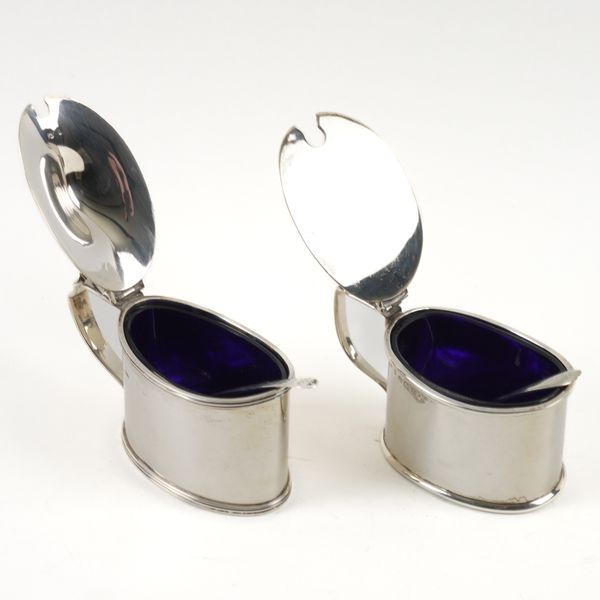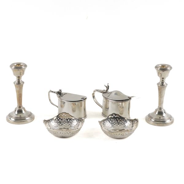 Comprising; an oval mustard pot, the hallmark rubbed, with a blue glass liner, another oval mustard pot, Birmingham 1910, a mustard spoon, Birmingham 1910, with a blue glass liner, a pair of bonbon dishes, having pierced decoration, the first Birmingham 1917, the second, the hallmark rubbed, combined weight 266 grams, a pair of candlesticks, Birmingham 1966, height 12cm (loaded) and a plated salt spoon