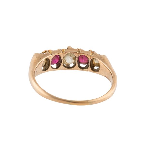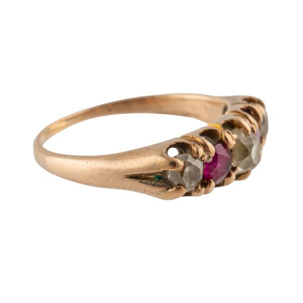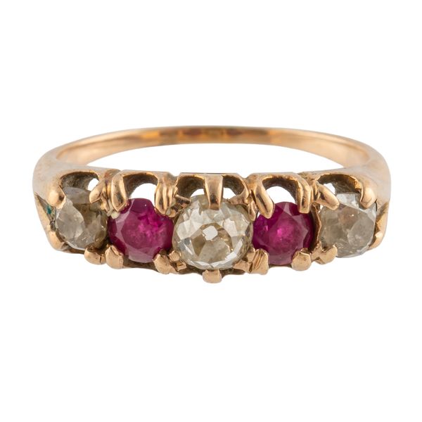 Mounted with old cut diamonds and round cut rubies, in claw settings, in unmarked gold, size K½, gross weight 2.3 grams