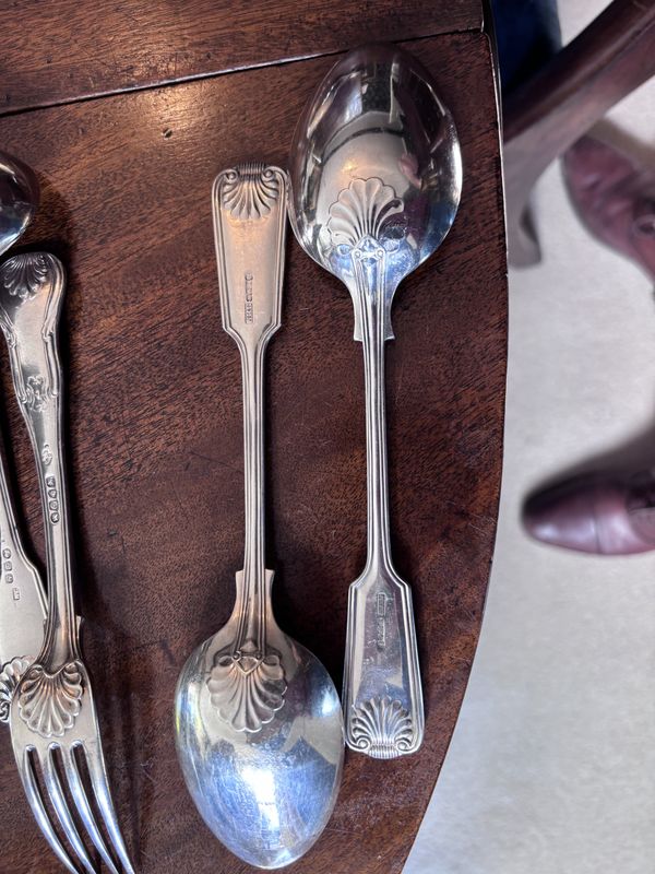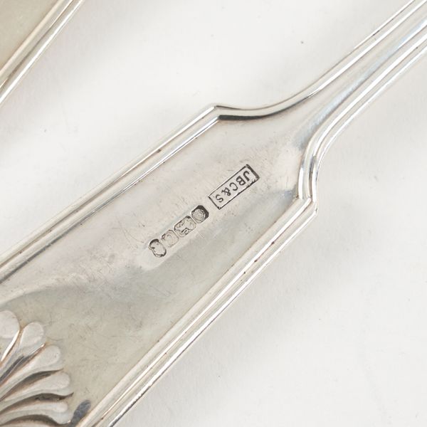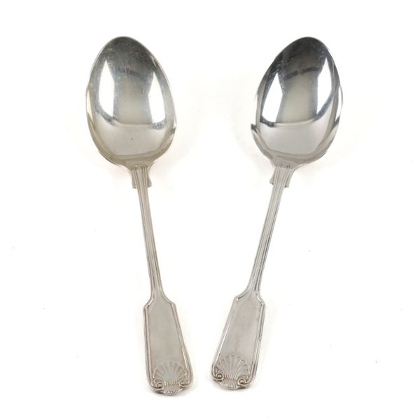 A PAIR OF SILVER DOUBLE STRUCK FIDDLE AND SHELL PATTERN TABLESPOONS (2)