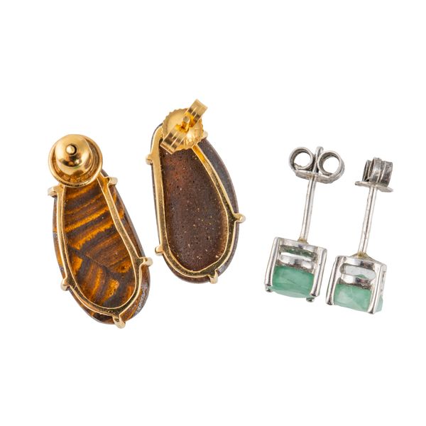 Comprising, a pair of opal doublet earrings, with unmarked gold settings and posts and mismatched butterflies, gross weight 3.7 grams and a pair of aventurine quartz earrings in silver mounts with post and butterfly fittings