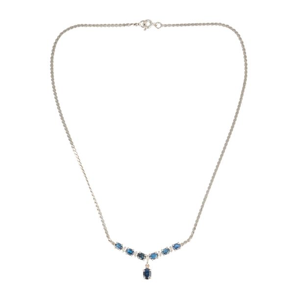 The front claw set with a curved row of six oval cut sapphires and with five small circular cut diamonds mounted at intervals, the front with a claw set oval cut sapphire single stone drop, the serpentine link necklace on a boltring clasp, detailed 750, length 37.5cm, gross weight 9.7 grams