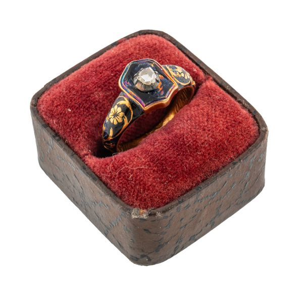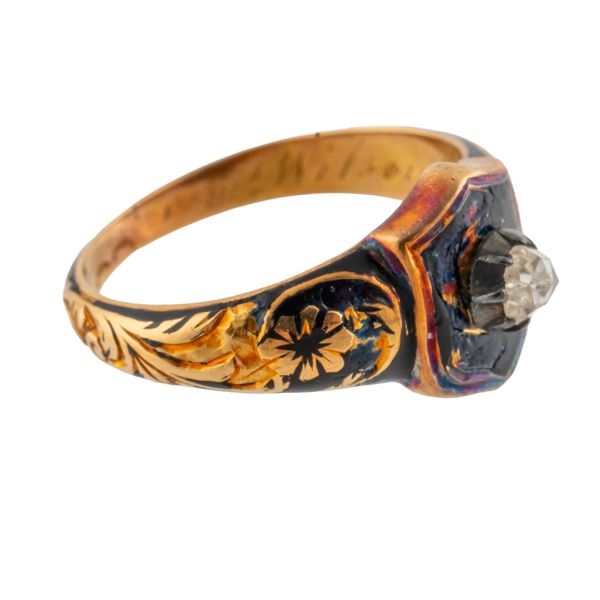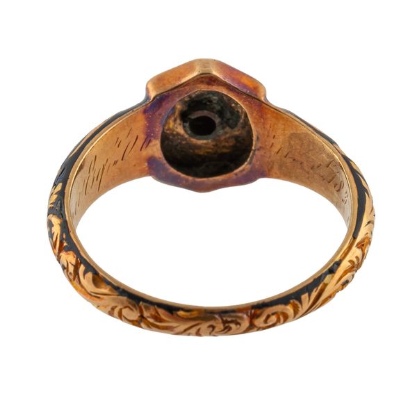 Centrally set with a rose cut diamond on a black enamel ground, the band decorated with floral and scrolling motifs, the inside of the band with some of a hallmark and a worn mourning inscription, size M, gross weight 2.5 grams, with a box