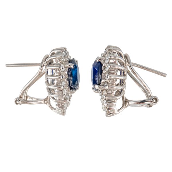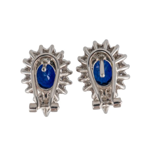 Each claw set with an oval cut sapphire at the centre, within a surround of round brilliant cut diamonds, unmarked, with post and sprung clip fittings, length 16mm, gross weight 6.1 grams