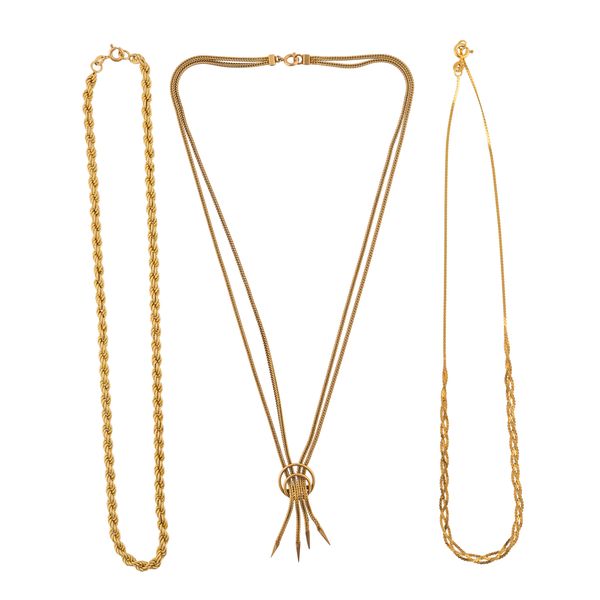 Comprising; a twist link chain, 41cm in length, a chain with a braided centre, measuring 41cm in length, and a two row snake chain with a tassel motif in the centre, measuring approximately 45cm in length with drop, combined gross weight 22.7 grams