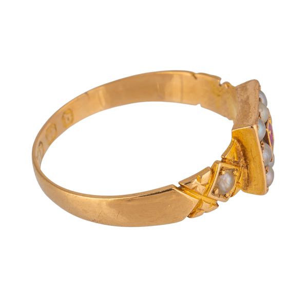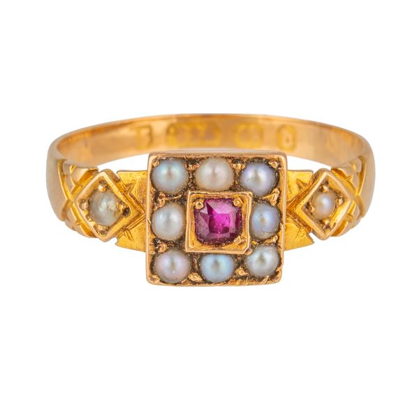 Mounted with the square cut ruby at the centre within a surround of eight half pearls, between half pearl shoulders, Birmingham 1878, ring size O½, gross weight 1.8 grams