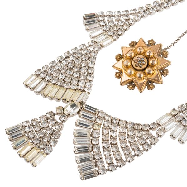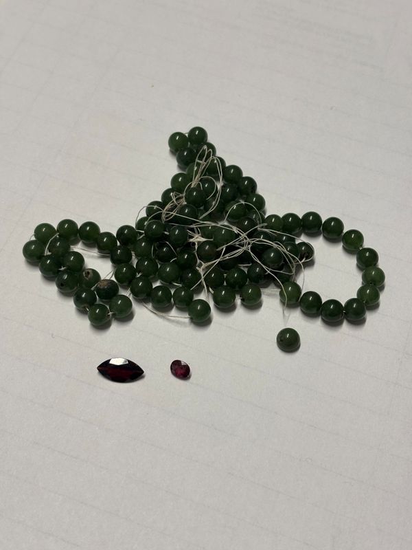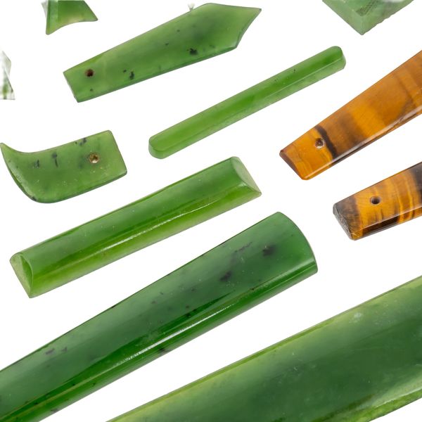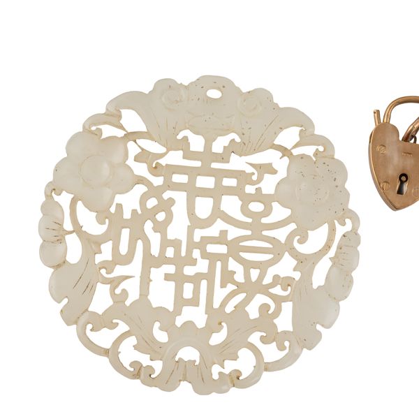 Comprising; a gold brooch with an Isle of Man motif, detailed 9 CT, gross weight 1 gram, another brooch, a 9ct gold heart shaped padlock clasp, weight 2.2 grams, a colourless paste costume necklace, an Asian circular jade pendant, with carved and pierced decoration, a quantity of nephrite beads, further nephrite items, two tiger's eye pendants and two red gemstones