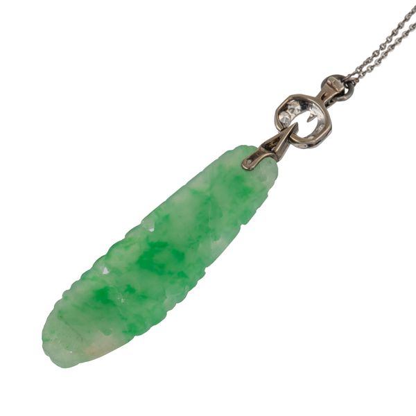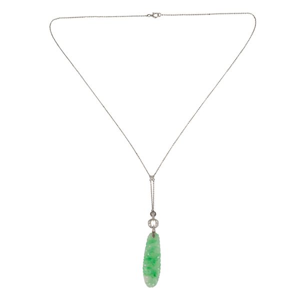 The jade pendant with carved and pierced floral decoration, the diamond surmount mounted with single cut diamonds, the neckchain unmarked, further set with a diamond above the pendant, with a boltring clasp, unmarked, length of pendant 5cm, gross weight 6.1 grams
