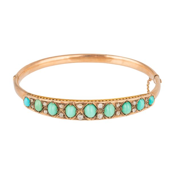The front mounted with a row of nine graduated oval turquoise and with eight pairs of diamonds mounted at intervals, on a snap clasp, detailed 9 CT, circa 1915, fitted with a safety chain, internal minimal diameter 5cm and maximum internal diameter 5.8cm, gross weight 9.4 grams