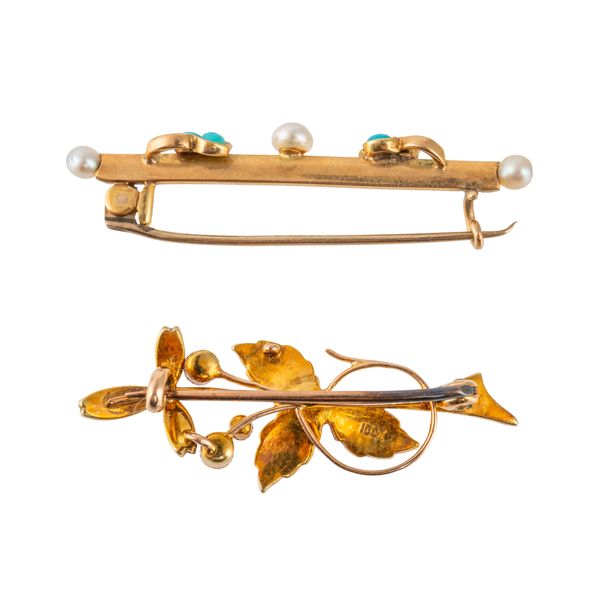 The former designed as a foliate spray, detailed 15 CT, length 3.7cm, gross weight 3.1 grams and the latter having two turquoise trefoil motifs and with three pearls mounted at intervals, unmarked, length 4cm, gross weight 2.8 grams