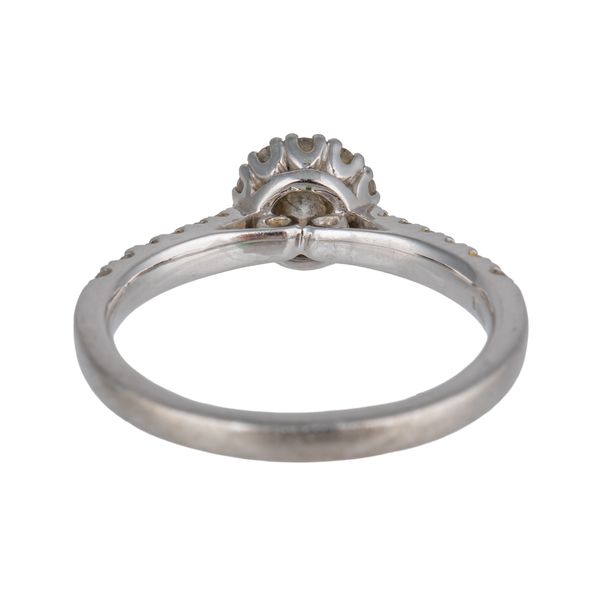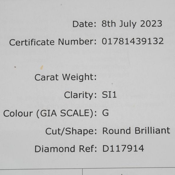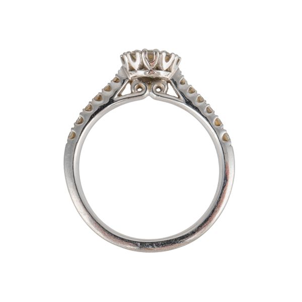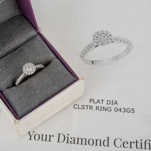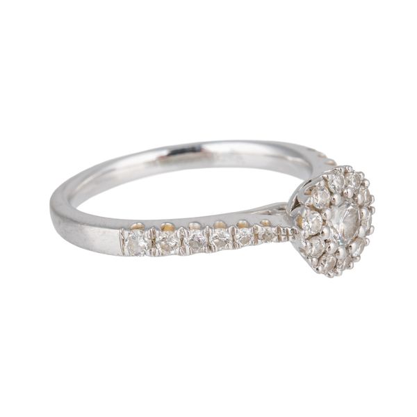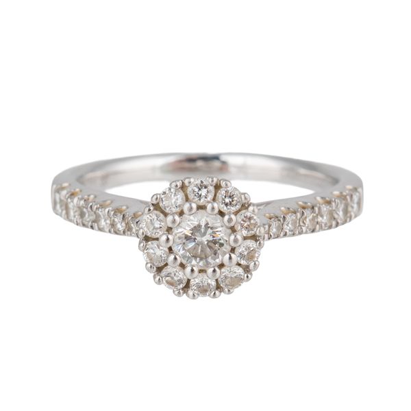 Mounted with the principal round brilliant cut diamond, in a surround of smaller round brilliant cut diamonds, between diamond set tapered shoulders, ring size J, gross weight 4.3 grams, with a box and a certificate stating clarity SI1 and colour G