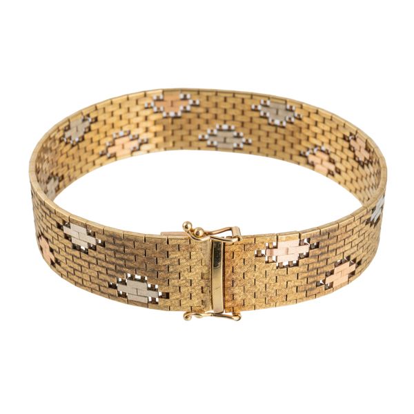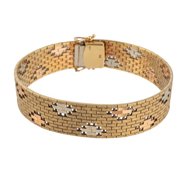 In a brick link design, having a partly textured finish, on a snap clasp, detailed 9 K, import mark London 1977, length 19cm, weight 31.3 grams