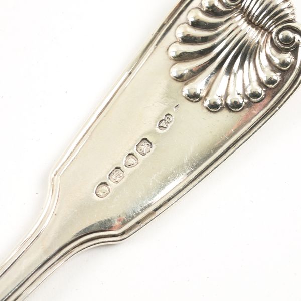 The silver double struck, fiddle, thread and shell stuffing spoon, London 1852, weight 209 grams, together with a plated Old English pattern stuffing spoon and similar soup ladle