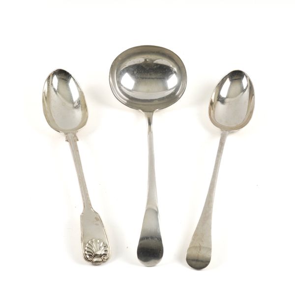 A VICTORIAN SILVER STUFFING SPOON, A PLATED STUFFING SPOON AND A PLATED SOUP LADLE (3)