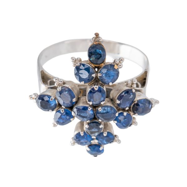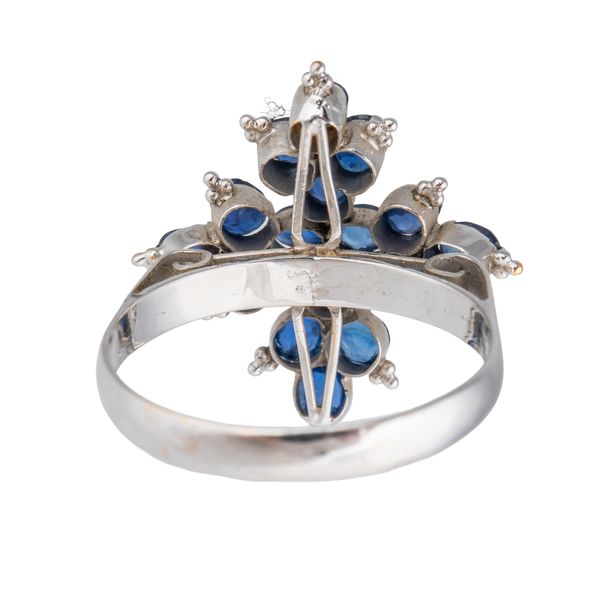 Claw set with oval cut sapphires in a quatrefoil shaped design, unmarked, ring size M, gross weight 3.3 grams