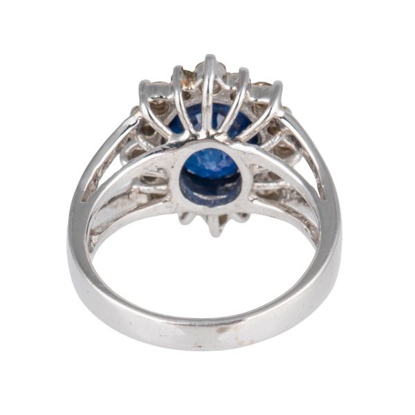 A WHITE GOLD, SAPPHIRE AND DIAMOND OVAL CLUSTER RING