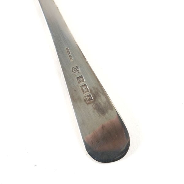 Comprising; a napkin ring with bark textured decoration, London 1972, another napkin ring, London 1977 and two christening spoons, the one with the fig shaped bowl, London 1974, the feather edged Old English pattern, one Birmingham 1966, combined weight 128 grams, with two cases