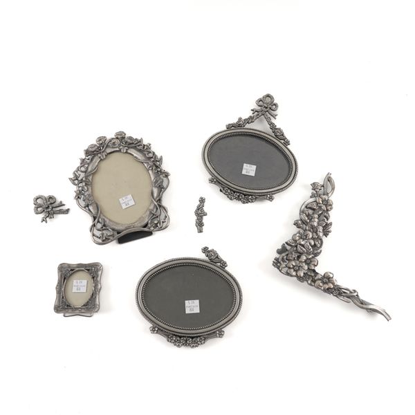 Comprising; a silver mounted rectangular photograph frame, with floral, foliate and scroll decoration to the border, Sheffield 1997, size 32cm x 26.7cm, a silver plated metal mounted photograph frame, having scallop motifs to the corners, size 30.5cm x 25.3cm, a silver plated metal mounted photograph frame, decorated with beaded borders, size 27cm x 21cm and five various base metal mounted frames and fittings