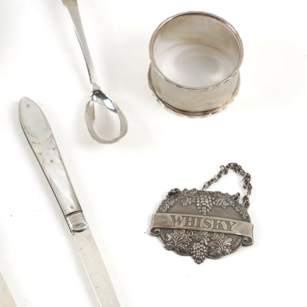 Comprising; a set of four decanter labels, each detailed Silver, two napkin rings, a book marker, having a rabbit finial and a mustard spoon, combined weight 158 grams, a silver and mother-of-pearl christening knife and fork and two silver bladed mother-of-pearl folding fruit knives, also a plated tap, with a case and a circular pewter mounted glass dish
