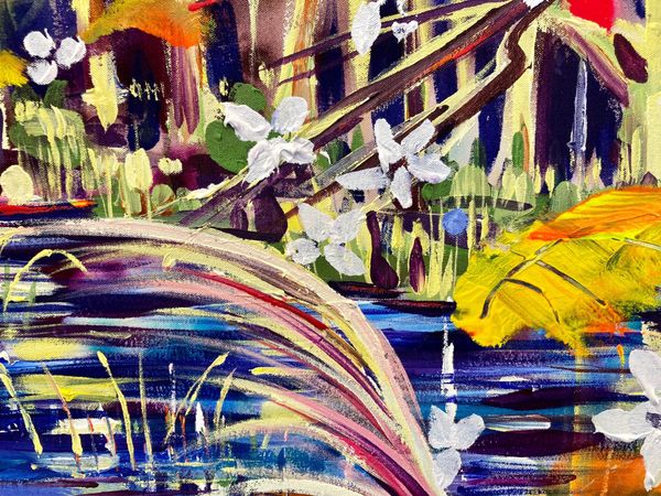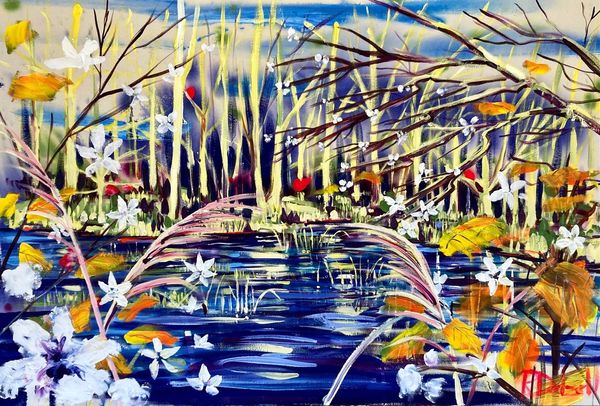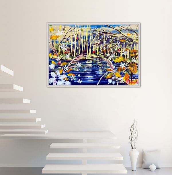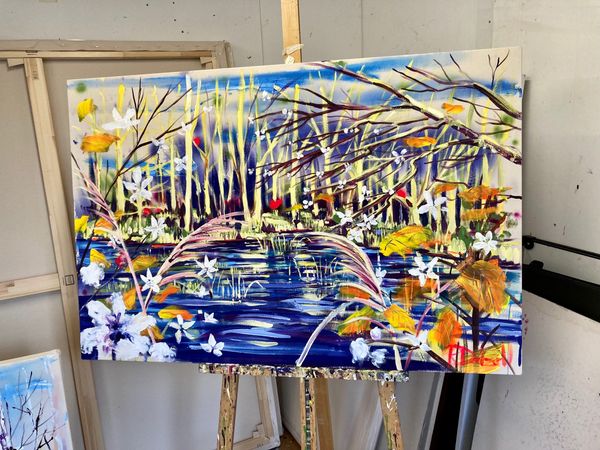 'Winter’s Flooded Forest’ is an atmospheric painting of a flooded forest in winter’s warm light. The foliage in the foreground and trees beyond create a sense of depth and intrigue. The rich colour palette gives the painting an uplifting feel.