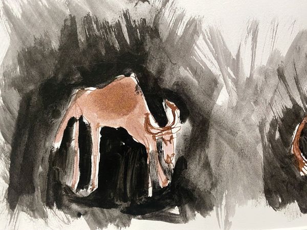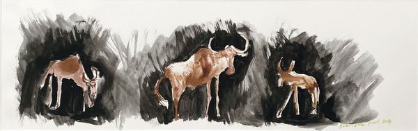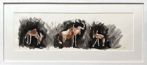A framed ink drawing of wildebeest caught in the headlights. Gabrielle Pool’s ink drawings on paper are inspired by her years living in Africa and are simple and charming. Using an unforgiving medium she produces portraits of African animals that are delicately poised between reality and abstraction with an underlying humour that reflects a positive vision of the world.
