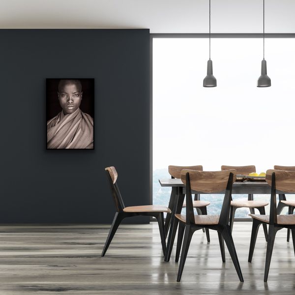 Kenny uses local village huts as primitive makeshift studios. His light is simply that of the sun reflected off the parched soil. This diffuse illumination allows him to capture a remarkable level of detail. His subjects calm demeanour belies the reality of harsh arid winds, extreme temperatures and dust.