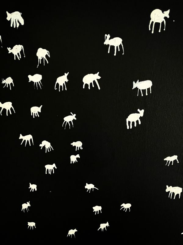 A wonderful collection of white sheep on a hill side in Jordan, luminescent in the night sky. A perfect counterpart to its "day time" companion, 'Black Bedouin Sheep'. The two paintings act as a diptych, the sheep representing the mountainous terrain where they live and forming a continuous skyline.