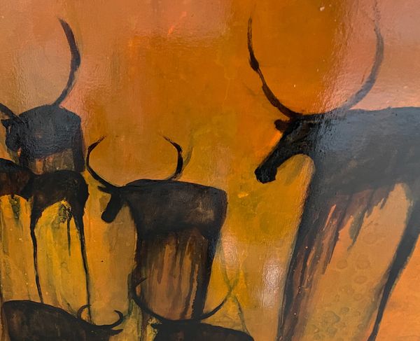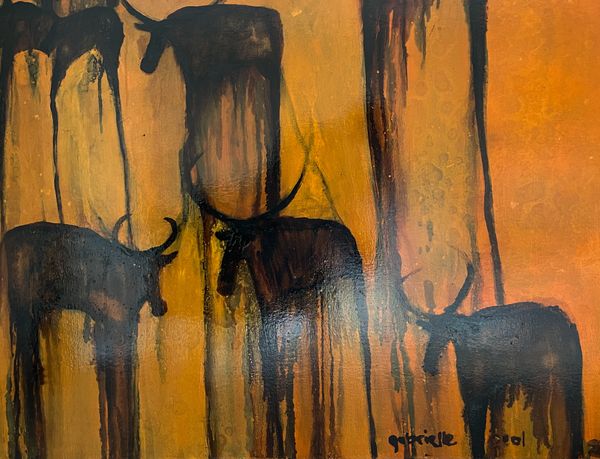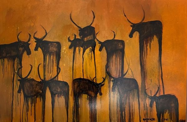 A painting of wildebeest on the move on a hot African plain. Their bodies appear to bleed into the landscape, becoming a part of and almost physically linked to the environment in which they exist. Gabrielle Pool’s oil paintings are large and expressive. They are built up of many layers of rich, earthy paint and linseed oil using a variety of painting techniques. These impressive pieces are a unique portrayal of the fragility and significance of nature.
