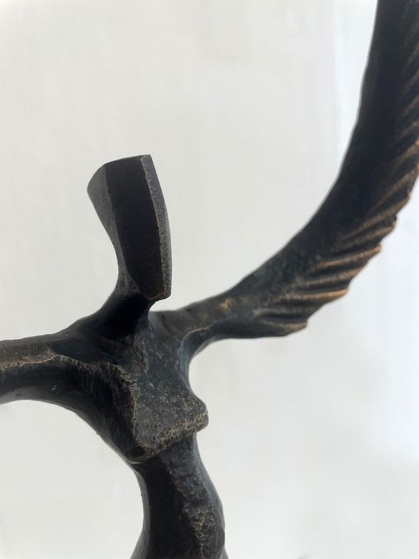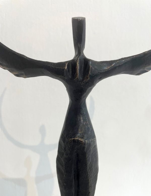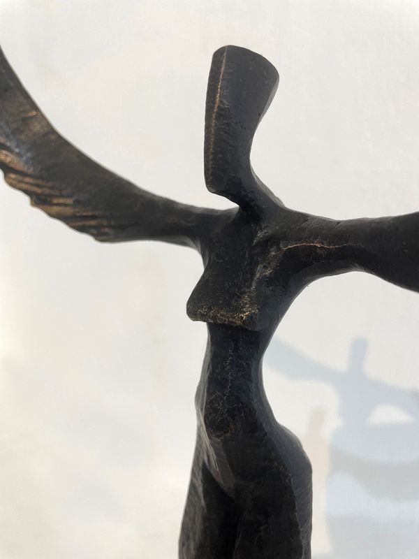 Helena III is an elegant figurative bronze sculpture by Nando Kallweit. Nando’s minimalist pieces have elegant, elongated limbs and an erect posture. Helena's wings suggest a woman reborn.