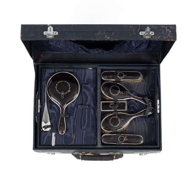 A silver and tortoiseshell mounted silver dressing set, Richard Comyns, London 1928, the backs with inset silver wreath motif, in a fitted dressing case