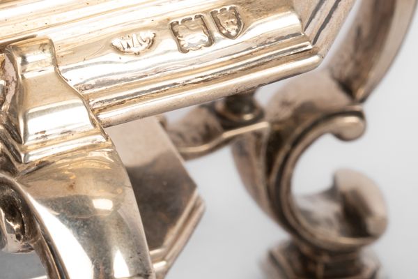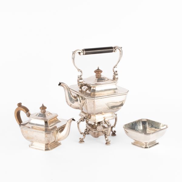 A matched three-piece silver tea service comprising a tea kettle on stand with burner, William Comyns, London 1913, a teapot, London 1914 and a sugar basin, Charles & Richard Comyns, London 1917, of square canted form, approximately 3049g