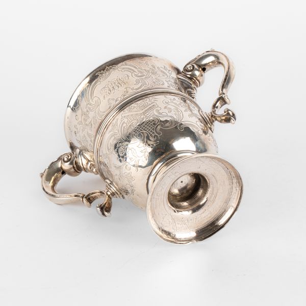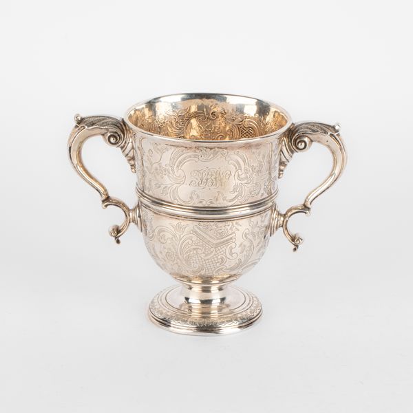 An Irish silver twin-handled silver cup, Richard Tudor, Dublin circa 1770, with leaf capped scroll handles, initialled, engraved throughout with scrolls and flowers, 13cm high, approximately 404g