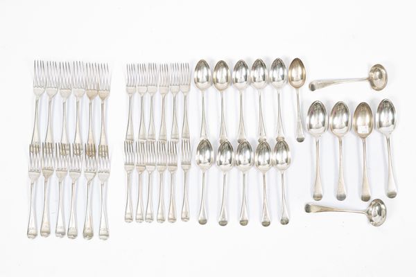 A matched set of Old English pattern silver flatware, various dates and makers, initialled, comprising four tablespoons, twelve table forks, eleven dessert spoons, twelve dessert forks, a pair of sauce ladles and a soup ladle, approximately 2792g