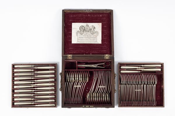 A matched Georgian silver-gilt thread pattern dessert service mostly Thomas Northcote, London 1790, comprising twenty four dessert spoons, twenty four dessert forks, twenty four silver-handled dessert knives (Moses Brent), crested, and a pair of gilt-metal grape scissors, all in a fitted oak canteen with label for Hamlet, Goldsmith & Jewellery to His Majesty, approximately 1580g weighable