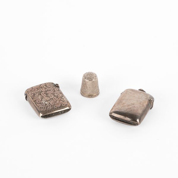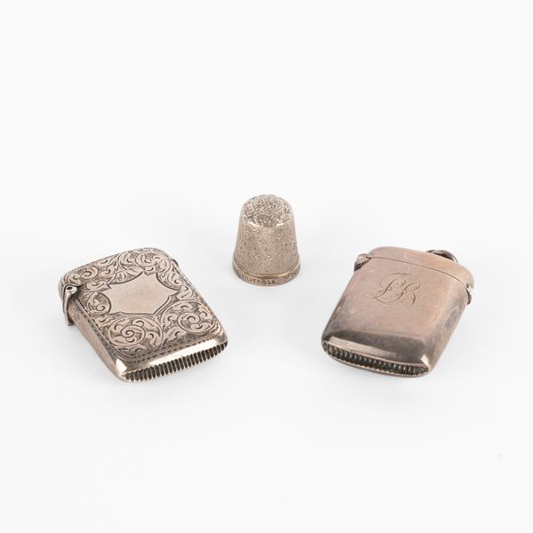 An Edwardian silver vesta case, Minshull & Latimer, Birmingham 1901, with engraved scroll decoration, another, William Aitken, Birmingham 1901, initialled and a Sterling silver thimble (3)