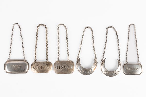 A group of six decanter labels, including a silver crescent-shaped example for Madeira, Peter & Ann Bateman, London 1791, a silver crescent-shaped example for Port, Phipps & Robinson, London 1798, a silver canted rectangular example for Sherry, Joseph Willmore, Birmoingham 1805, a modern silver example and two unmarked and two cut glass decanters