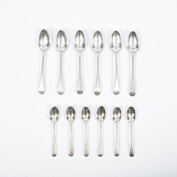 A closely matched set of six George III silver feather-edge dessert spoons, various dates and makers including provincial, initialled, and a closely matched set of George III bright-cut teaspoons, approximately 258g