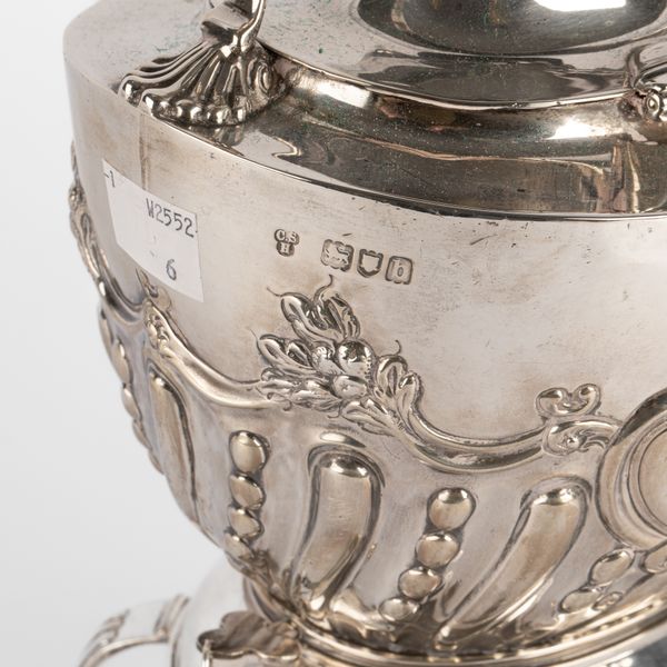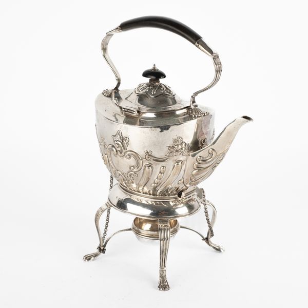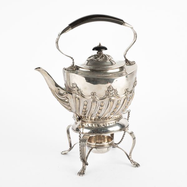 An Edwardian silver kettle on stand, Charles Stuart Harris, London 1903, of oval shape with ebonised handle and finial, the cover to the burner missing, inscribed to Major and Mrs F J Bywater and dated 1936, 30cm high, approximately 1038g