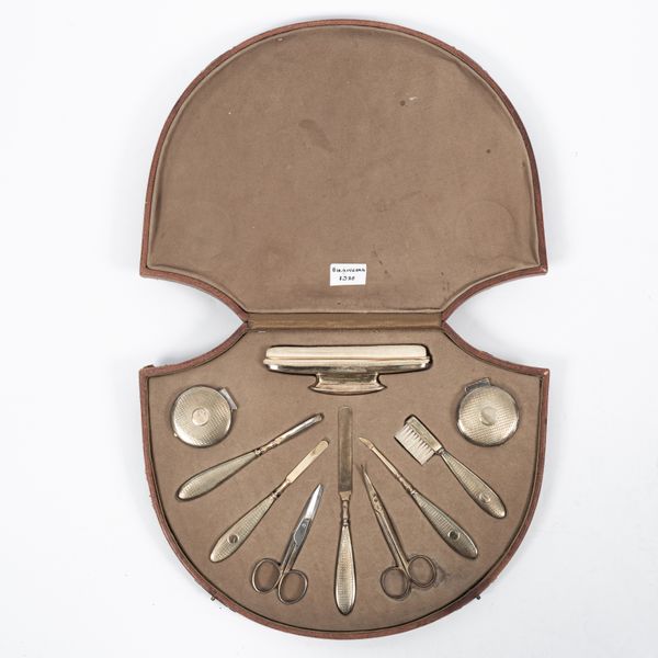 A silver-gilt manicure set, SB, Birmingham 1920, including two small circular pots, a nail file, a nail buffer etc., in a fitted case initialled CLG