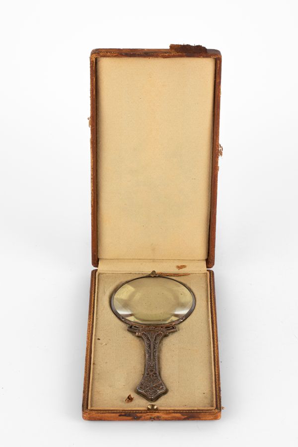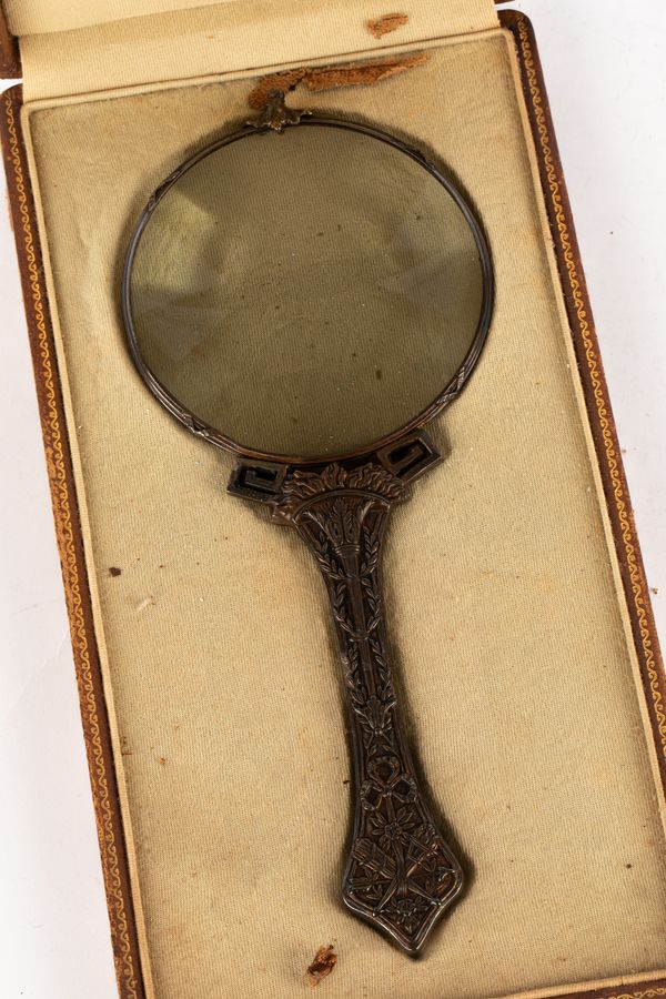 A French silver-framed magnifying glass, the circular lens to a handle decorated with wreaths, ribbon ties and trophies of arms, 20cm long, in fitted case