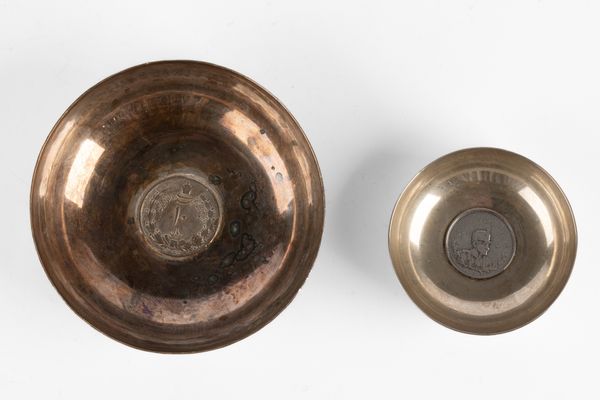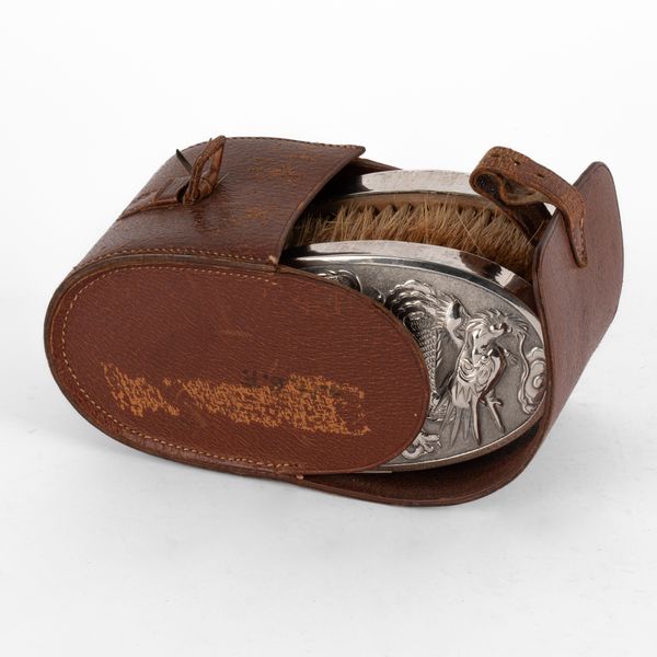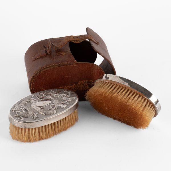 A pair of Chinese export silver backed hair brushes, Wing Nam & Co., Hong Kong circa. 1910, the backs with repousse dragons among clouds, monogrammed, in leather case and two white metal ashtrays, each centred by a Persian coin (3)