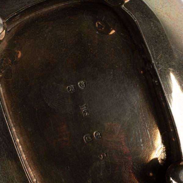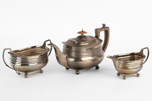A George III silver three-piece tea set, Samuel Hennell, London 1811, of oblong shape with band of reeded decoration, on ball feet, the teapot with ivory finial, approximately 1089g