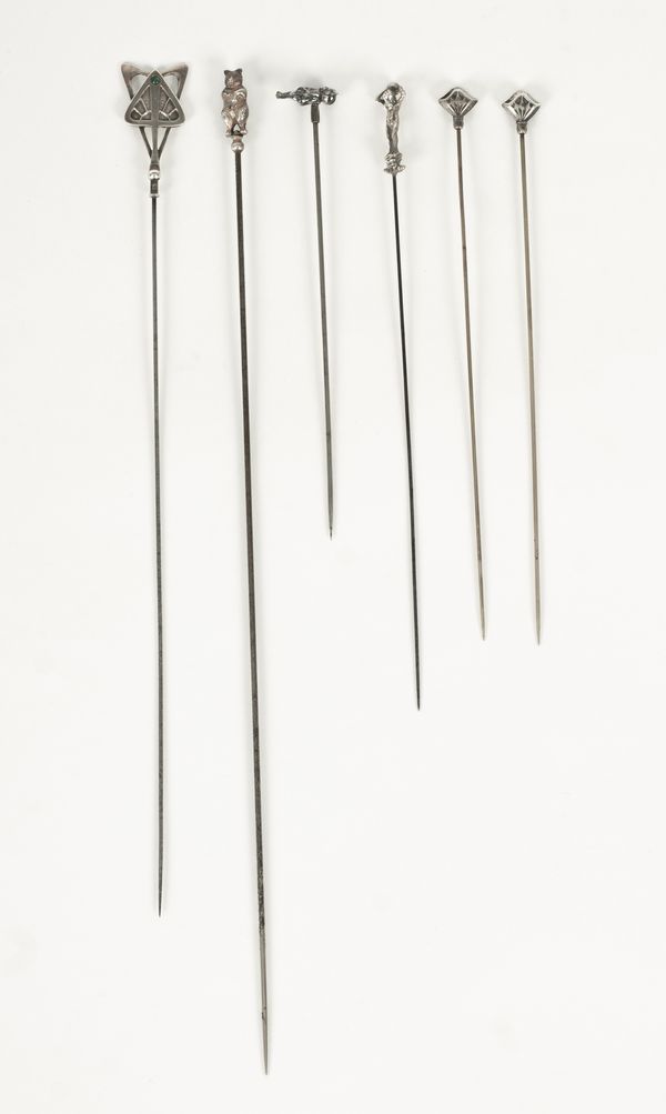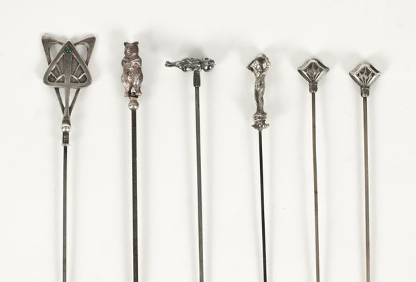 Six Edwardian hatpins, comprising an Art Nouveau and green gem set hatpin, marked sterling, one in the form of the Lincoln imp, an Atlas hatpin, a bear with a ball at its feet, unmarked and a pair of diamond shaped hatpins