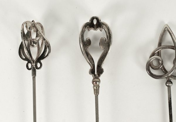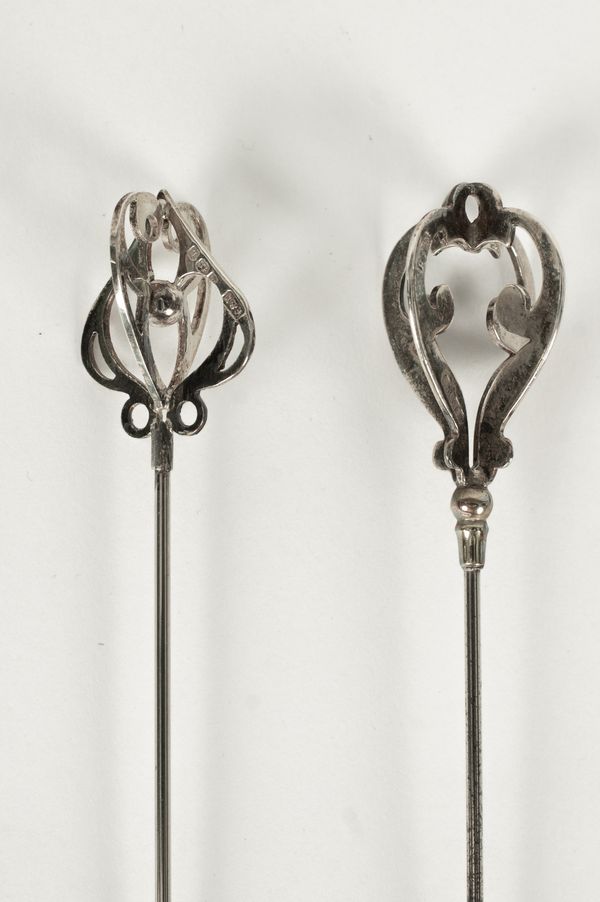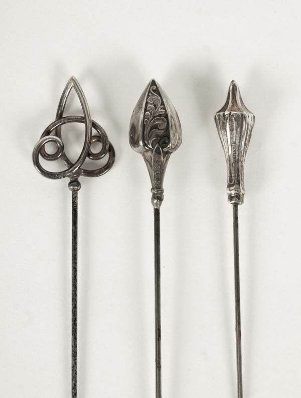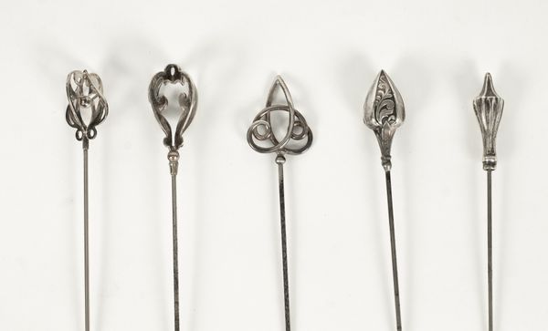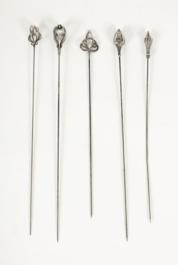 An Edwardian silver hatpin, Pearce & Thompson, Birmingham 1907, and four other silver hatpins, two marked sterling (5)